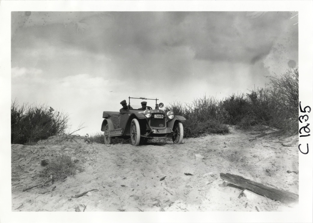 View of motorists in Hupmobile car on sand dune during the Hupmobile United American Tour. The tour was also known as the Hupmobile Capital-to-Capital tour. Handwritten on back: "Hupmobile United America [sic] tour, August 28, 1916 - January 21, 1917. Photo by William H. Krohn."