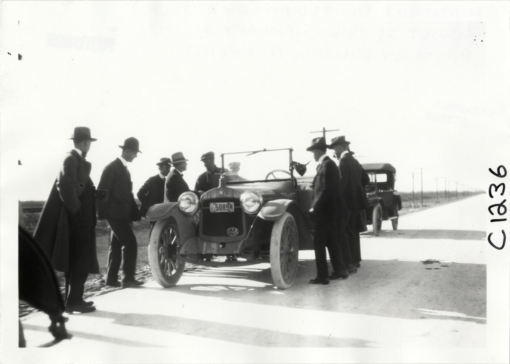View of men surrounding Hupmobile car during the Hupmobile United American Tour. The tour was also known as the Hupmobile Capital-to-Capital tour. Handwritten on back: "Hupmobile United America [sic] tour, August 28, 1916 - January 21, 1917. Photo by William H. Krohn."