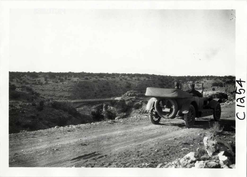 View of motorists with Hupmobile car looking at bridge in desert during the Hupmobile United American Tour. The tour was also known as the Hupmobile Capital-to-Capital tour. Handwritten on back: "Hupmobile United America [sic] tour, August 28, 1916 - January 21, 1917. Photo by William H. Krohn."