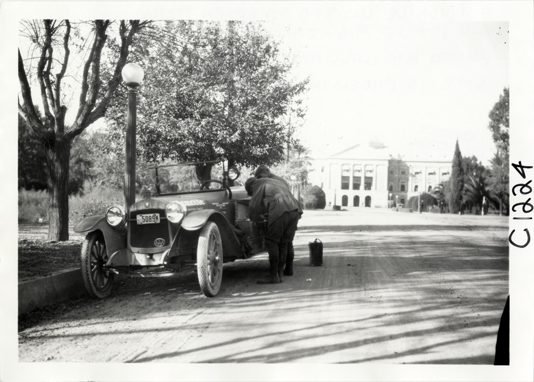 View of motorists with Hupmobile car in front of Arizona state capitol building at Phoenix, Arizona during the Hupmobile United American Tour. The tour was also known as the Hupmobile Capital-to-Capital tour. Handwritten on back: "Hupmobile United America [sic] tour, August 28, 1916 - January 21, 1917. Photo by William H. Krohn. Site is Phoenix, Arizona."