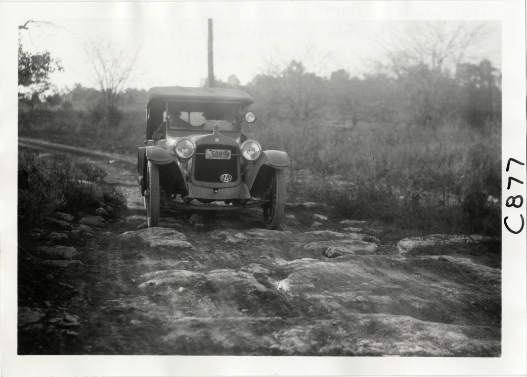 View of motorists in Hupmobile car traveling on rocky road during the Hupmobile United American Tour. The tour was also known as the Hupmobile Capital-to-Capital tour. Handwritten on back: "Hupmobile United America [sic] tour, August 28, 1916 - January 21, 1917. Photo by William H. Krohn."