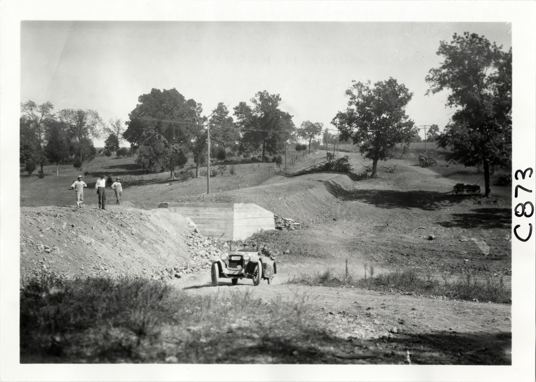 View of motorists in Hupmobile car at embankment near Jefferson City, Missouri during the Hupmobile United American Tour. Three men stand atop embankment on left. The tour was also known as the Hupmobile Capital-to-Capital tour. Handwritten on back: "Hupmobile United America [sic] tour, August 28, 1916 - January 21, 1917. Photo by William H. Krohn. Site is outside of Jefferson City, Mo."