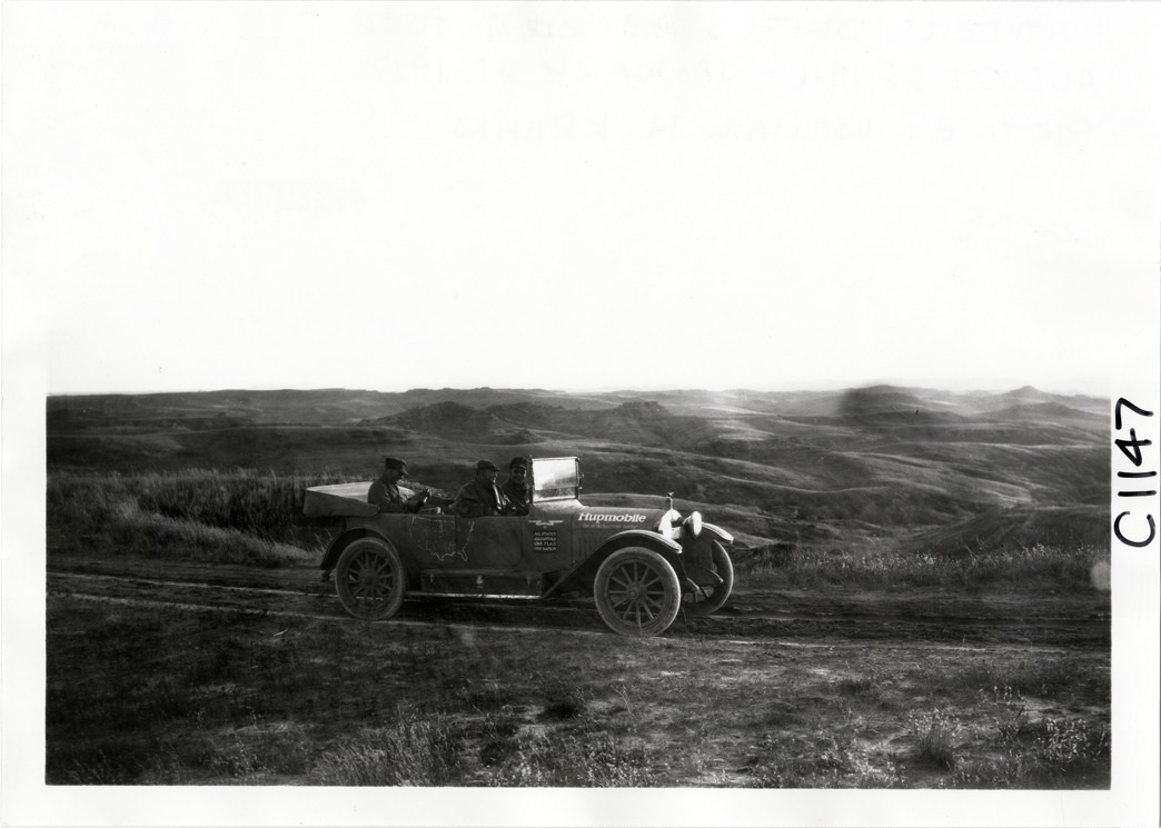 View of motorists in Hupmobile car traveling on rural dirt road during the Hupmobile United American Tour. The tour was also known as the Hupmobile Capital-to-Capital tour. Handwritten on back: "Hupmobile United America [sic] tour, August 28, 1916 - January 21, 1917. Photo by William H. Krohn."