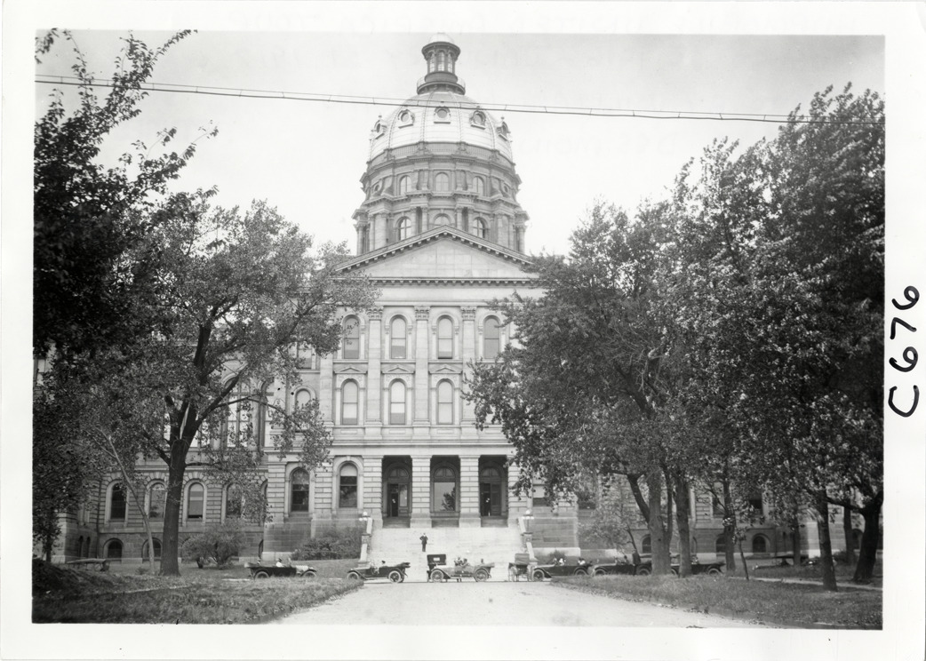 Hupmobile automobile and other automobiles in front of Iowa state capitol building, Hupmobile United American Tour