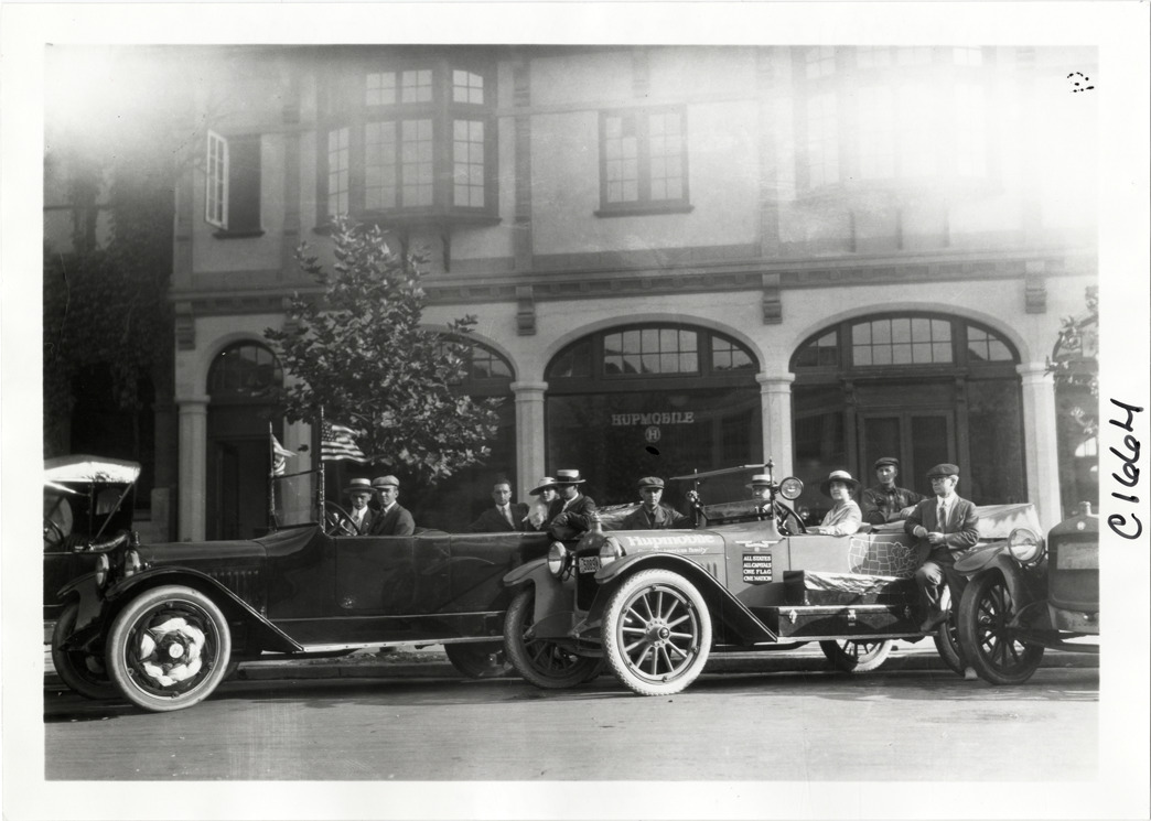 View of men and women posing with Hupp car and an unidentified car in front of Hupmobile automobile dealership during the Hupmobile United American Tour. The tour was also known as the Hupmobile Capital-to-Capital tour. Handwritten on back: "Hupmobile United America [sic] tour, August 28, 1916 - January 21, 1917. Photo by William H. Krohn."