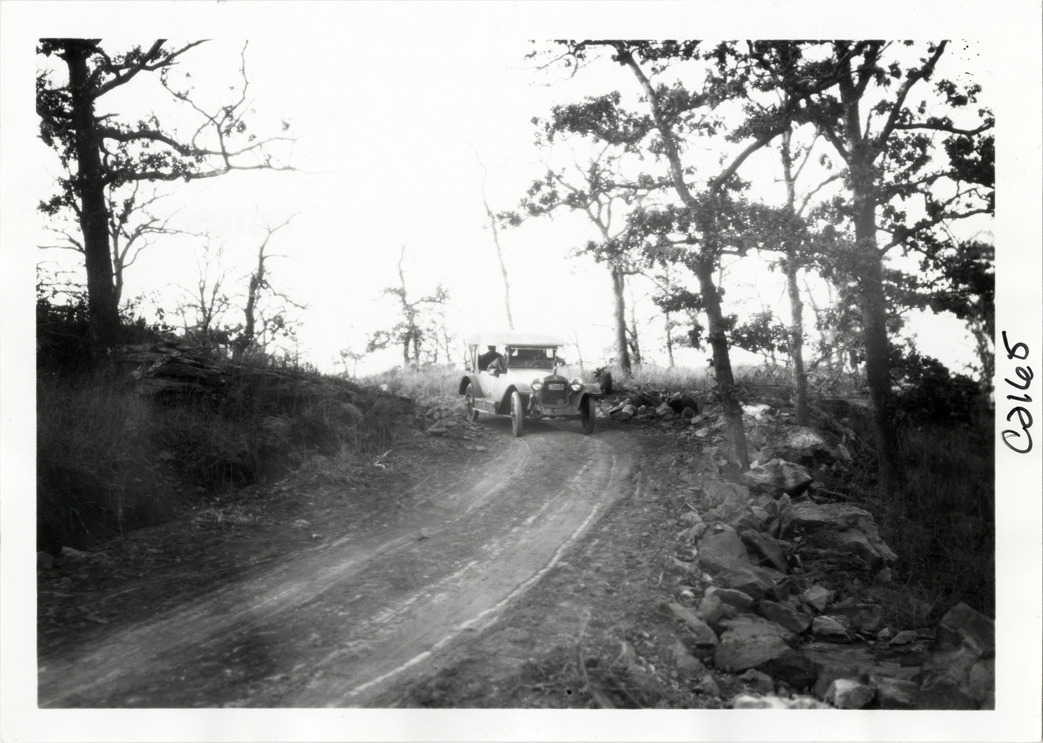 View of motorists in Hupmobile car traveling on rural dirt road during the Hupmobile United American Tour. The tour was also known as the Hupmobile Capital-to-Capital tour. Handwritten on back: "Hupmobile United America [sic] tour, August 28, 1916 - January 21, 1917. Photo by William H. Krohn."