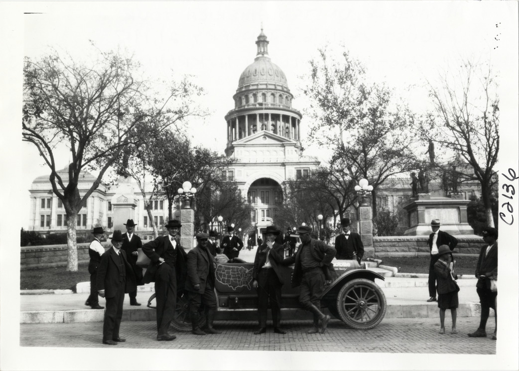 Men posing with Hupmobile automobile in front of Texas state capitol building, Hupmobile United American Tour