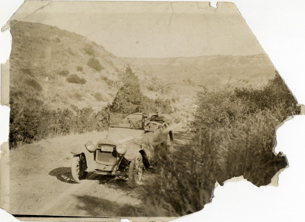 View of motorists in Hupmobile car traveling on mountain road during the Hupmobile United American Tour. The tour was also known as the Hupmobile Capital-to-Capital tour. Handwritten on back: "Hupp tour, 1916."