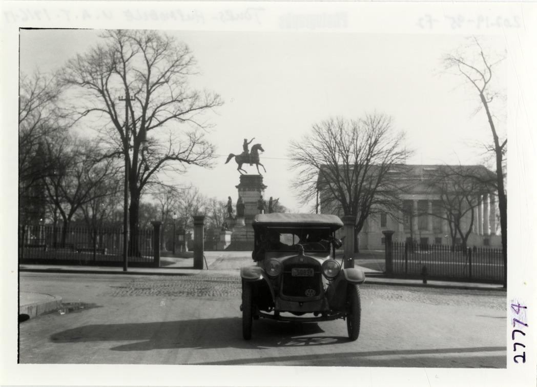 Hupmobile automobile parked in front of George Washington equestrian monument, Hupmobile United American Tour