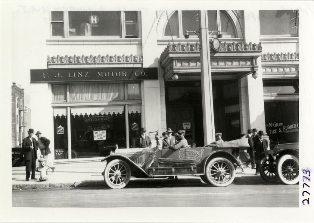 Motorists in Hupmobile automobile in front of F.J. Linz Motor Company dealership, Hupmobile United American Tour