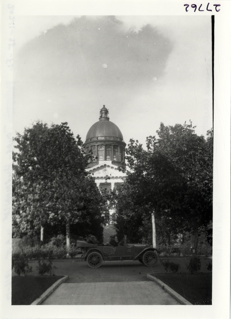 View of motorists in Hupmobile car parked in front of Oregon state capitol building at Salem, Oregon during the Hupmobile United American Tour. The tour was also known as the Hupmobile Capital-to-Capital tour. Handwritten on back: "Tours--Hupmobile U.A.T. 1916-17."