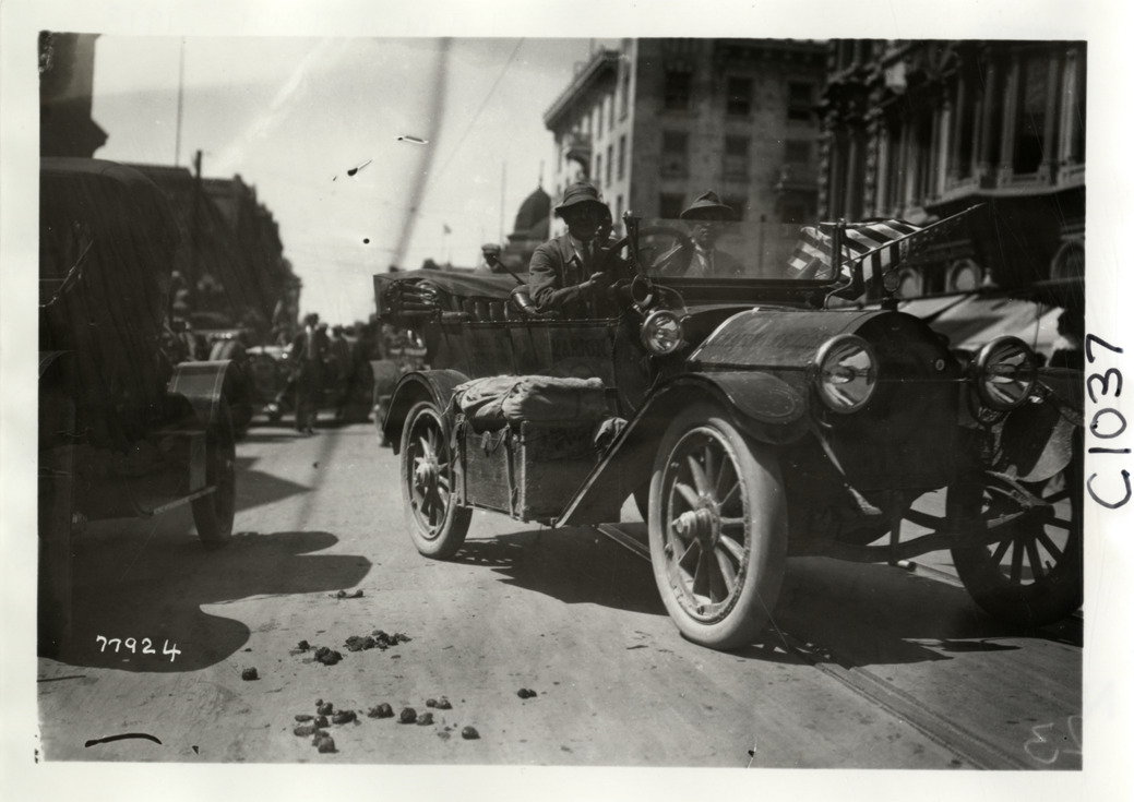 View of motorists posing in Marion car no. 8 during the 1913 transcontinental tour organized by Indiana Automobile Manufacturers' Association. Handwritten on back: "Marion, no. 8, J.B. Dudley, E.G. Gager. Photo by Spooner & Wells. Tours--I.A.M.A, 1913."
