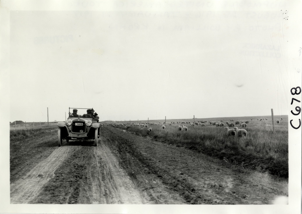 Motorists in Hupmobile automobile passing herd of sheep on rural road, Hupmobile United American Tour