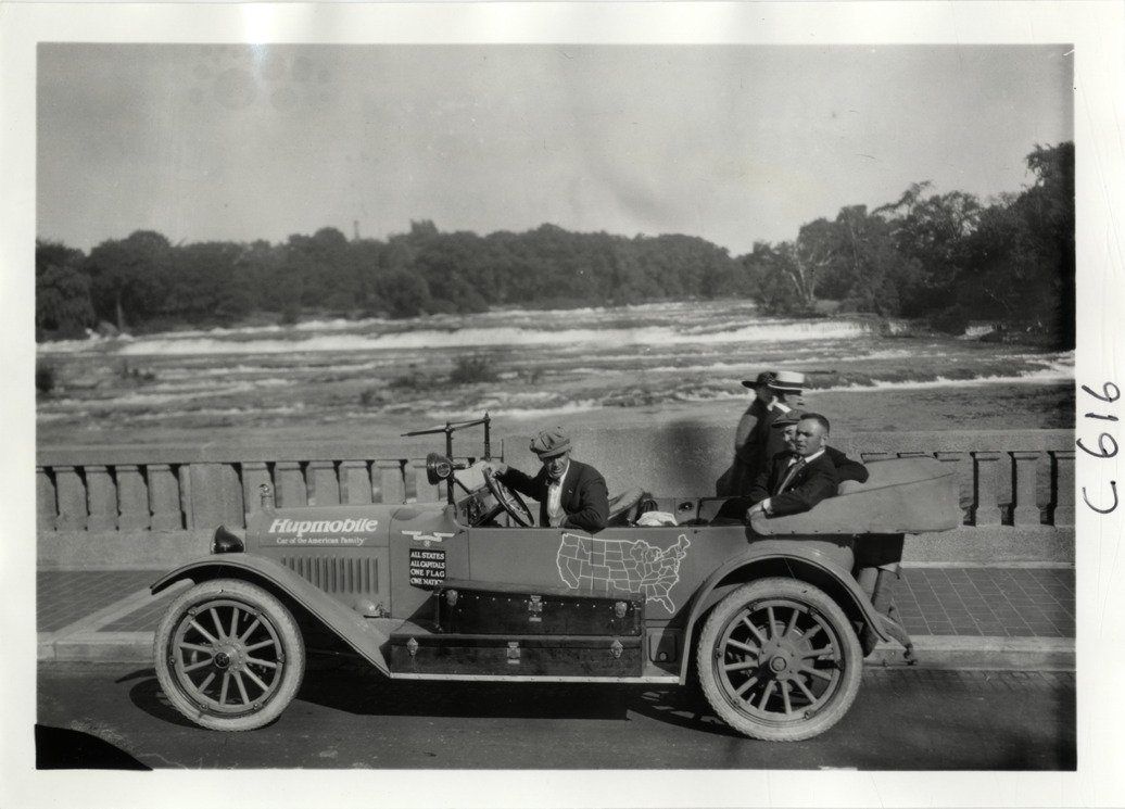 View of motorists in Hupmobile car on bridge during the Hupmobile United American Tour. River in background. The tour was also known as the Hupmobile Capital-to-Capital tour. Handwritten on back: "Hupmobile United America [sic] tour, August 28, 1916 - January 21, 1917. Photo by William H. Krohn."