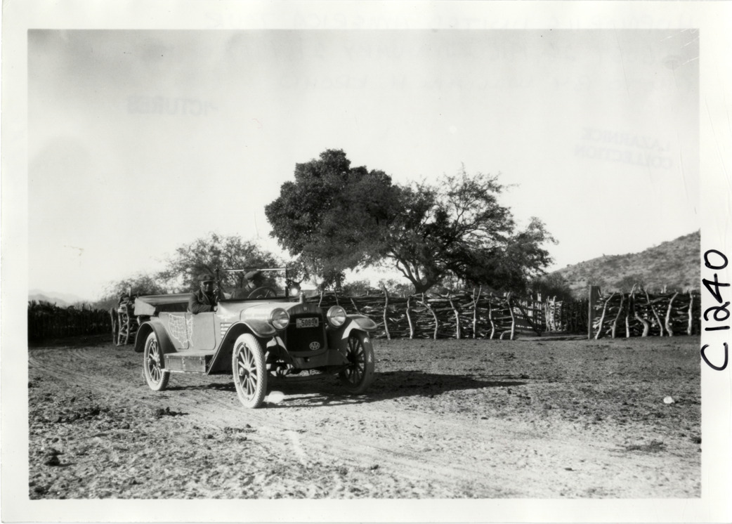 View of motorists in Hupmobile car traveling past rustic wooden fence during the Hupmobile United American Tour. The tour was also known as the Hupmobile Capital-to-Capital tour. Handwritten on back: "Hupmobile United America [sic] tour, August 28, 1916 - January 21, 1917. Photo by William H. Krohn."