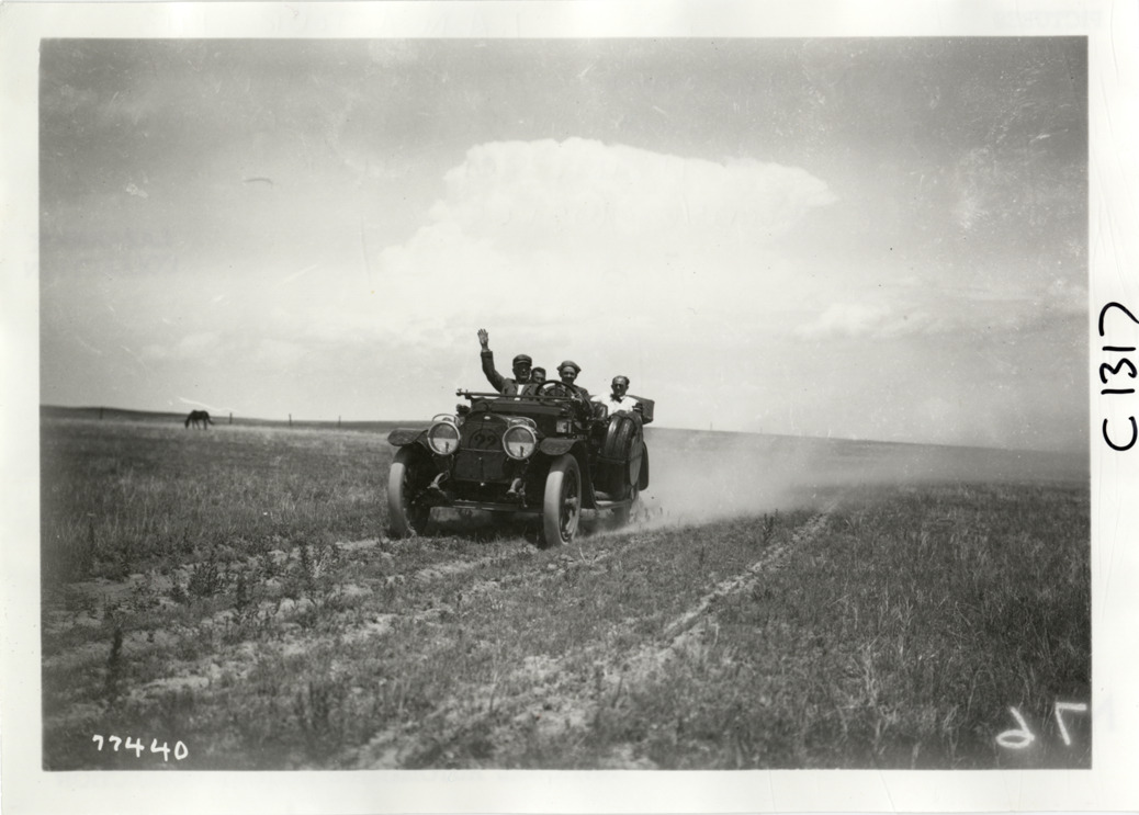 View of motorists in Marmon car no. 22 traveling on rural road during the 1913 transcontinental tour organized by Indiana Automobile Manufacturers' Association. Handwritten on back: "Marmon, no. 22, Carl G. Fisher, Charles A. Bookwalter, Robert Tyndall, Heine Schoeller. Photo by Spooner & Wells. Tours--I.A.M.A, 1913."