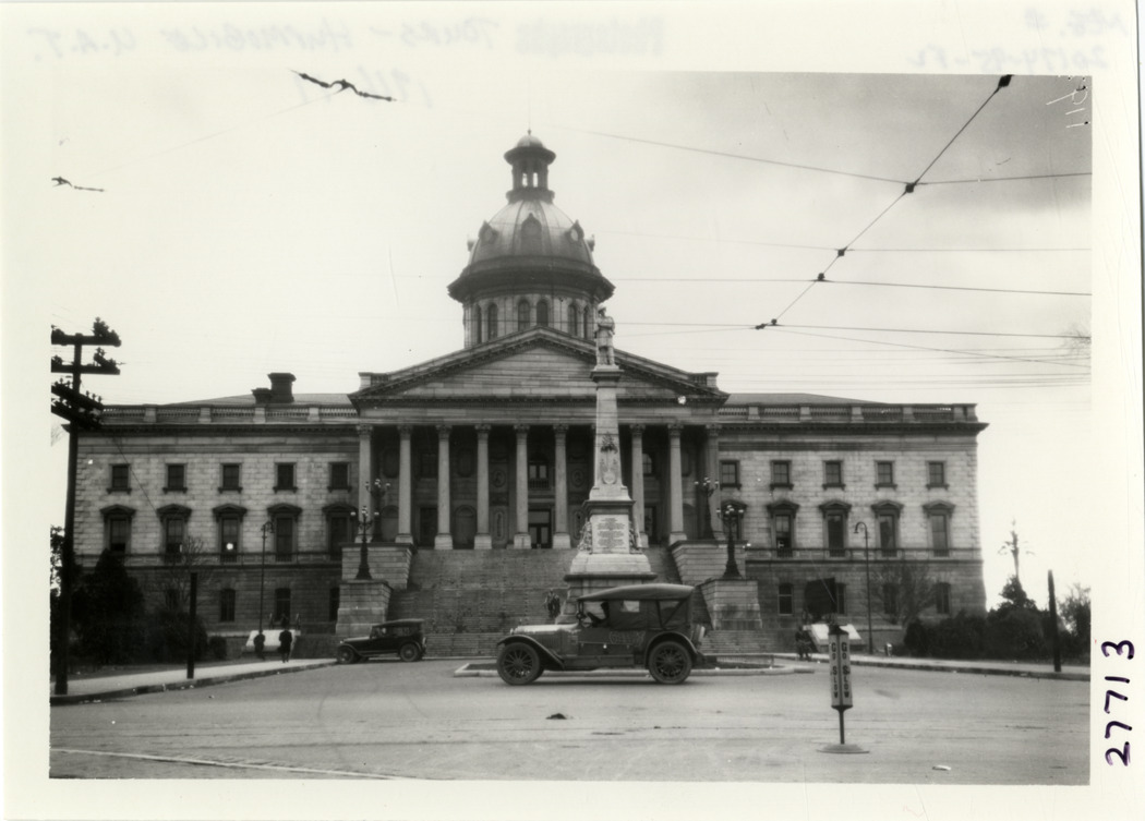 View of Hupmobile car parked in front of South Carolina state capitol building and Confederate soldiers' monument at Columbia, South Carolina during the Hupmobile United American Tour. The tour was also known as the Hupmobile Capital-to-Capital tour. Handwritten on back: "Tours--Hupmobile U.A.T. 1916-17."