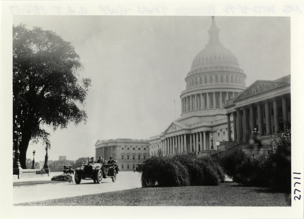 Motorists in Hupmobile automobile in front of U.S. Capitol building, Hupmobile United American Tour