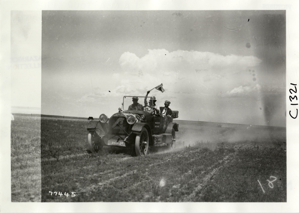 View of motorists in Henderson car no. 4 traveling on rural road during the 1913 transcontinental tour organized by Indiana Automobile Manufacturers' Association. Handwritten on back: "Henderson, no. 4, Frank Staley, W.S. Gilbreath, R.P. Henderson. Photo by Spooner & Wells. Tours--I.A.M.A, 1913."