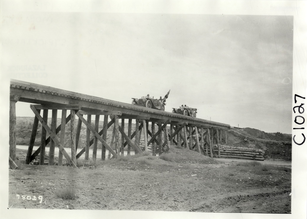 View of motorists with American car no. 2 and American car no. 1 on trestle bridge during the 1913 transcontinental tour organized by Indiana Automobile Manufacturers' Association. Handwritten on back: "American, no. 1, Ernest I. Lewis, D.L. Mobley, Charles Boyden. American, no. 2, Ray Price, Dr. C.R. Strickland, Eddie Gouth. Photo by Spooner & Wells. Tours--I.A.M.A, 1913."