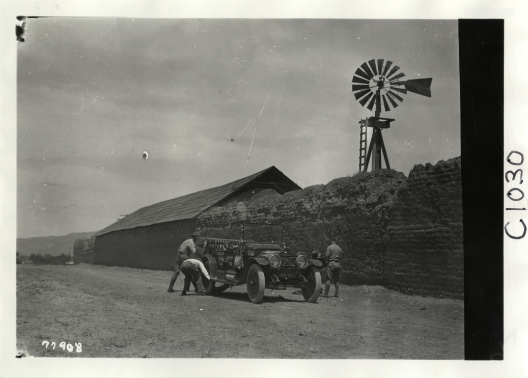 View of motorists changing tire on Marmon car no. 22 during the 1913 transcontinental tour organized by Indiana Automobile Manufacturers' Association. Windmill behind wall in background. Handwritten on back: "Marmon, no. 22, Carl G. Fisher, Charles A. Bookwalter, Robert Tyndall, Heine Schoeller. Photo by Spooner & Wells. Tours--I.A.M.A, 1913."