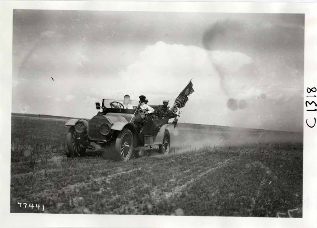 View of motorists in car traveling on rural road during the 1913 transcontinental tour organized by Indiana Automobile Manufacturers' Association. Handwritten on back: "Photo by Spooner & Wells. Tours--I.A.M.A, 1913."