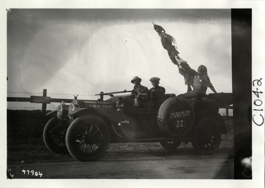 View of motorists posing in Marmon car no. 22 during the 1913 transcontinental tour organized by Indiana Automobile Manufacturers' Association. Handwritten on back: "Marmon, no. 22, Carl G. Fisher, Charles A. Bookwalter, Robert Tyndall, Heine Schoeller. Photo by Spooner & Wells. Tours--I.A.M.A, 1913."