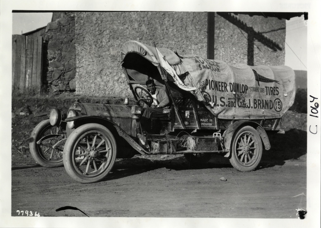 View of driver posing in Premier G & J tire truck during the 1913 transcontinental tour organized by Indiana Automobile Manufacturers' Association. Truck is decorated to resemble a covered wagon; "Use Pioneer Dunlop straight side tires, U.S. and G. & J. brand" is painted on canvas. Printed on front: "Spooner & Wells, Inc., N.Y." Handwritten on back: "Premier, G & J tire truck, no. 15, J.E. Blickert, Walter Weidley. Photo by Spooner & Wells. Tours--I.A.M.A, 1913."