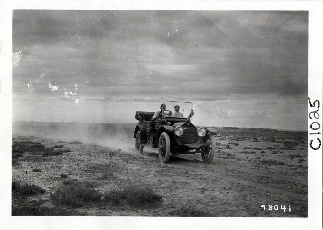 Motorists in Apperson automobile traveling on desert road, 1913 Indiana Automobile Manufacturers' Association tour