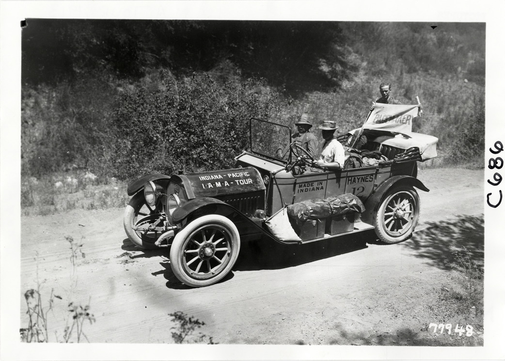 View of motorists posing with Haynes car no. 12 during the 1913 transcontinental tour organized by Indiana Automobile Manufacturers' Association. One man displays a "Pacemaker" flag. Handwritten on back: "Haynes, no. 12, R. Crawford, Elwood Haynes, C.A. Branston, L.R. Wagner. Photo by Spooner & Wells. Tours--I.A.M.A, 1913."