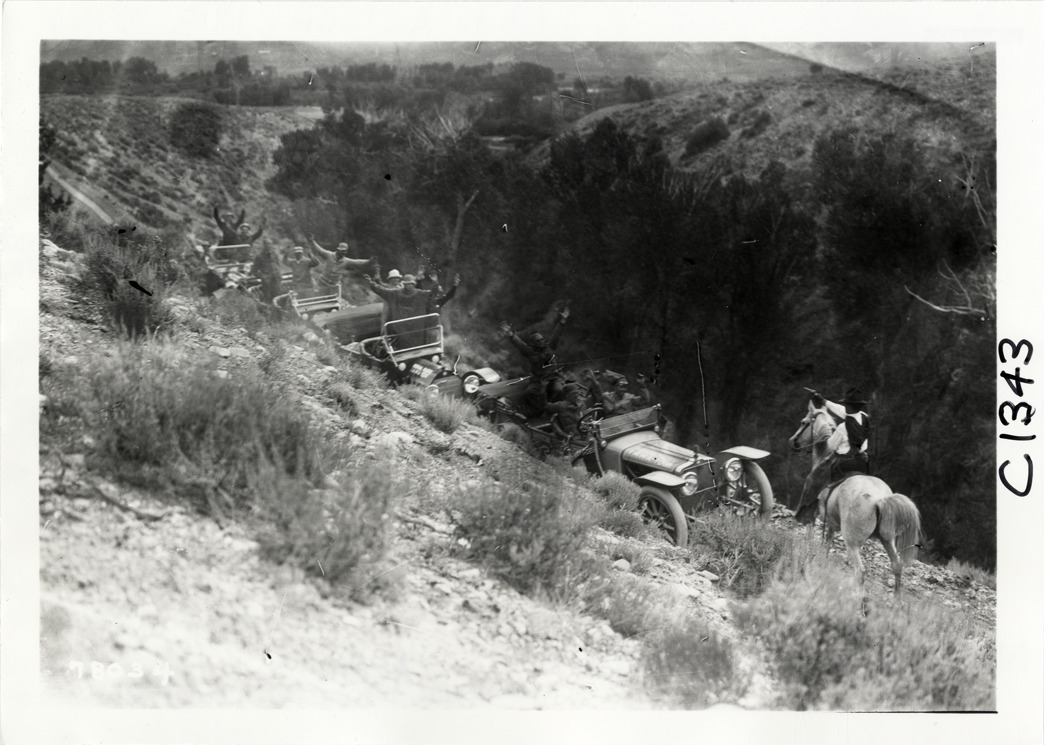 Mock stickup on mountain road, 1913 Indiana Automobile Manufacturers' Association tour