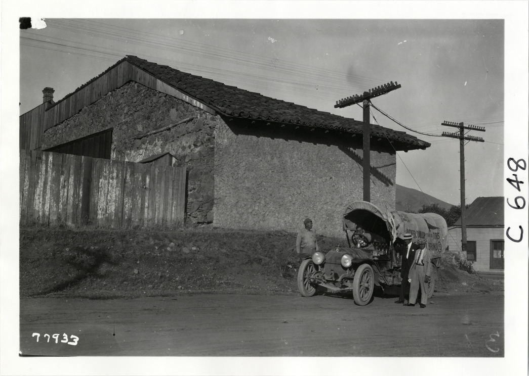 View of motorists posing with Premier G & J tire truck during the 1913 transcontinental tour organized by Indiana Automobile Manufacturers' Association. Truck is decorated to resemble a covered wagon; building with tile roof in background. Printed on front: "Spooner & Wells, Inc., N.Y." Handwritten on back: "Premier, G & J tire truck, no. 15, J.E. Blickert, Walter Weidley. Photo by Spooner & Wells. Tours--I.A.M.A, 1913."