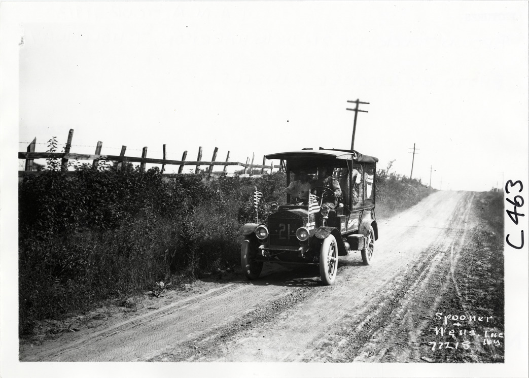 View of motorists in Brown truck no. 21 traveling on rural dirt road during the 1913 transcontinental tour organized by Indiana Automobile Manufacturers' Association. Truck is decorated with American flags. Printed on front: "Spooner & Wells, Inc., N.Y." Handwritten on back: "Brown truck, no. 21, W.W. Harrison, J. Holloway. Photo by Spooner & Wells. Tours--I.A.M.A, 1913."
