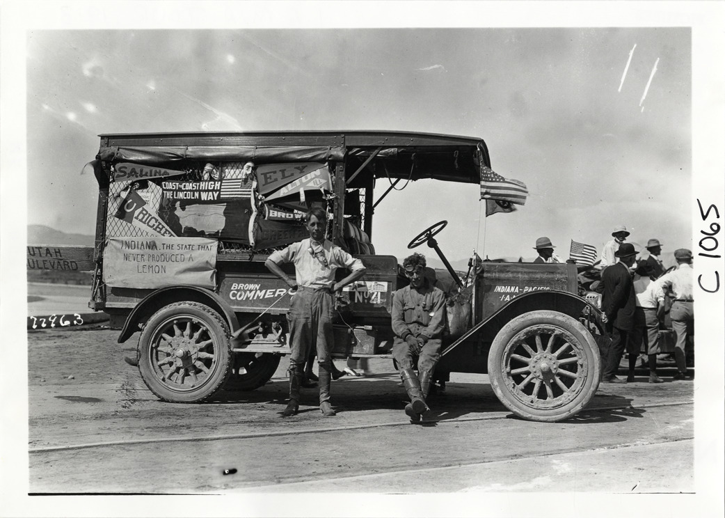 View of motorists posing with Brown truck no. 21 during the 1913 transcontinental tour organized by Indiana Automobile Manufacturers' Association. Truck is decorated with American flags, pennants, "Coast to coast, the Lincoln Highway" sign and "Indiana, the state that never produced a lemon" banner. Handwritten on back: "Brown truck, no. 21, W.W. Harrison, J. Holloway. Photo by Spooner & Wells. Tours--I.A.M.A, 1913."