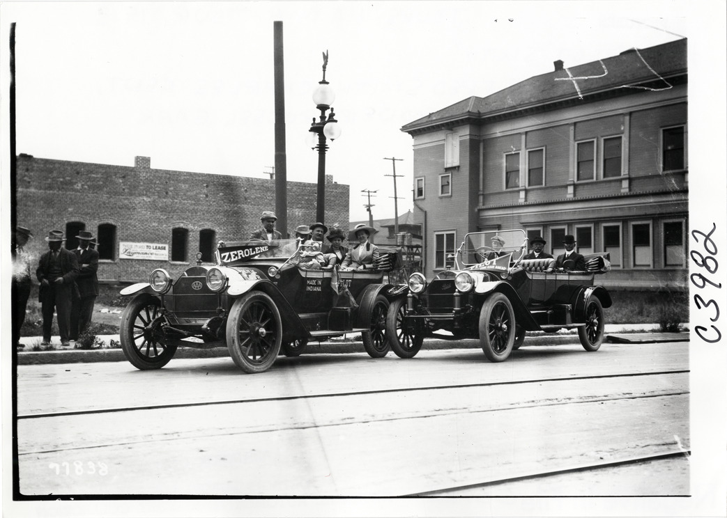 Motorists posing in Pilot automobiles, 1913 Indiana Automobile Manufacturers' Association tour
