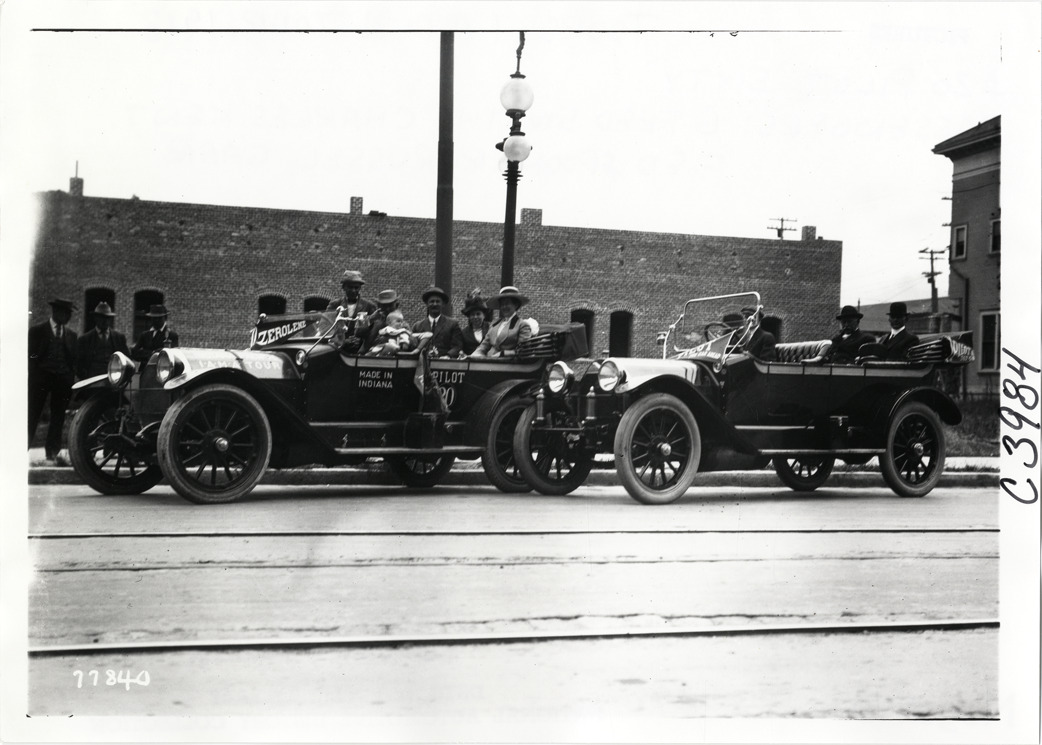Motorists posing in Pilot automobiles, 1913 Indiana Automobile Manufacturers' Association tour