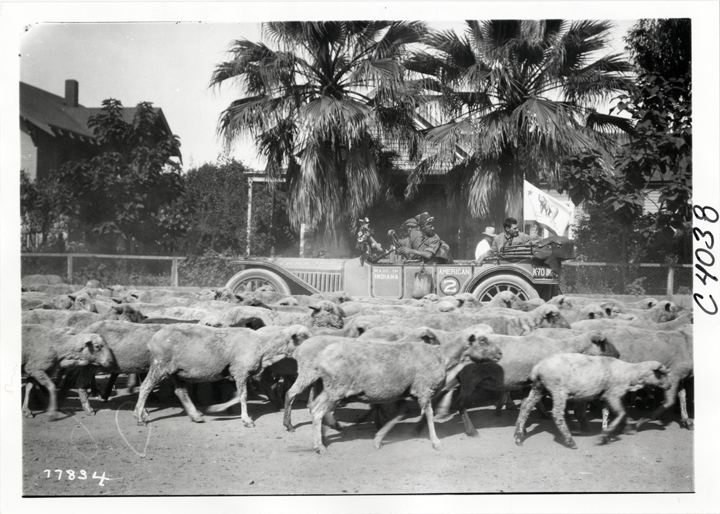 View of motorists in American car no. 2 passing herd of sheep during the 1913 transcontinental tour organized by Indiana Automobile Manufacturers' Association. Palm trees in background. Handwritten on back: "#2 American, passengers: Ray Price, Dr. C.R. Strickland, Eddie Gouth. Tours--I.A.M.A, 1913."