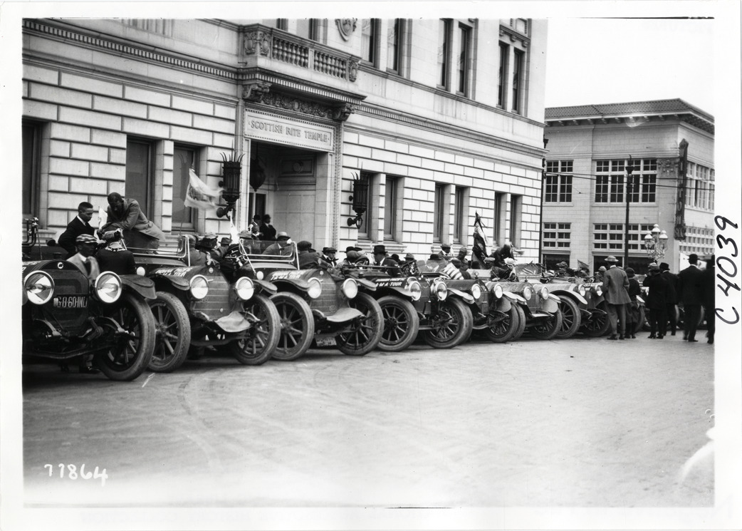 View of cars parked in front of Scottish Rite Temple during the 1913 transcontinental tour organized by Indiana Automobile Manufacturers' Association. Handwritten on back: "Tours--I.A.M.A, 1913."