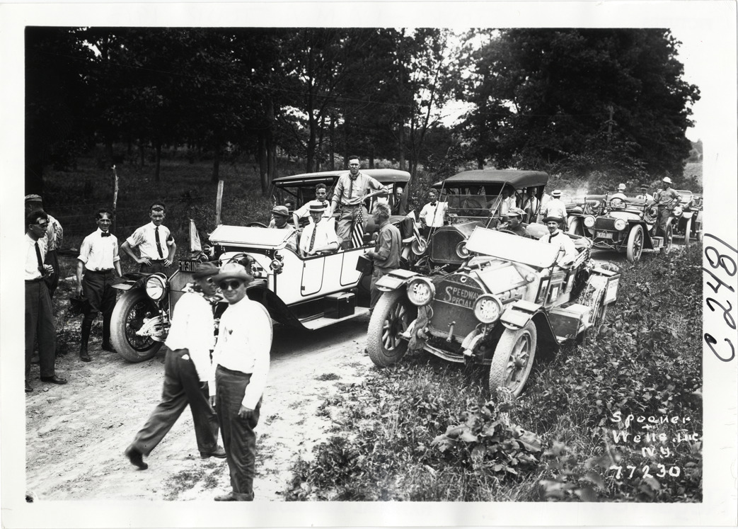 View of motorists with cars on rural dirt road during the 1913 transcontinental tour organized by Indiana Automobile Manufacturers' Association. Printed on front: "Spooner & Wells, Inc., N.Y." Handwritten on back: "Tours--I.A.M.A, 1913."