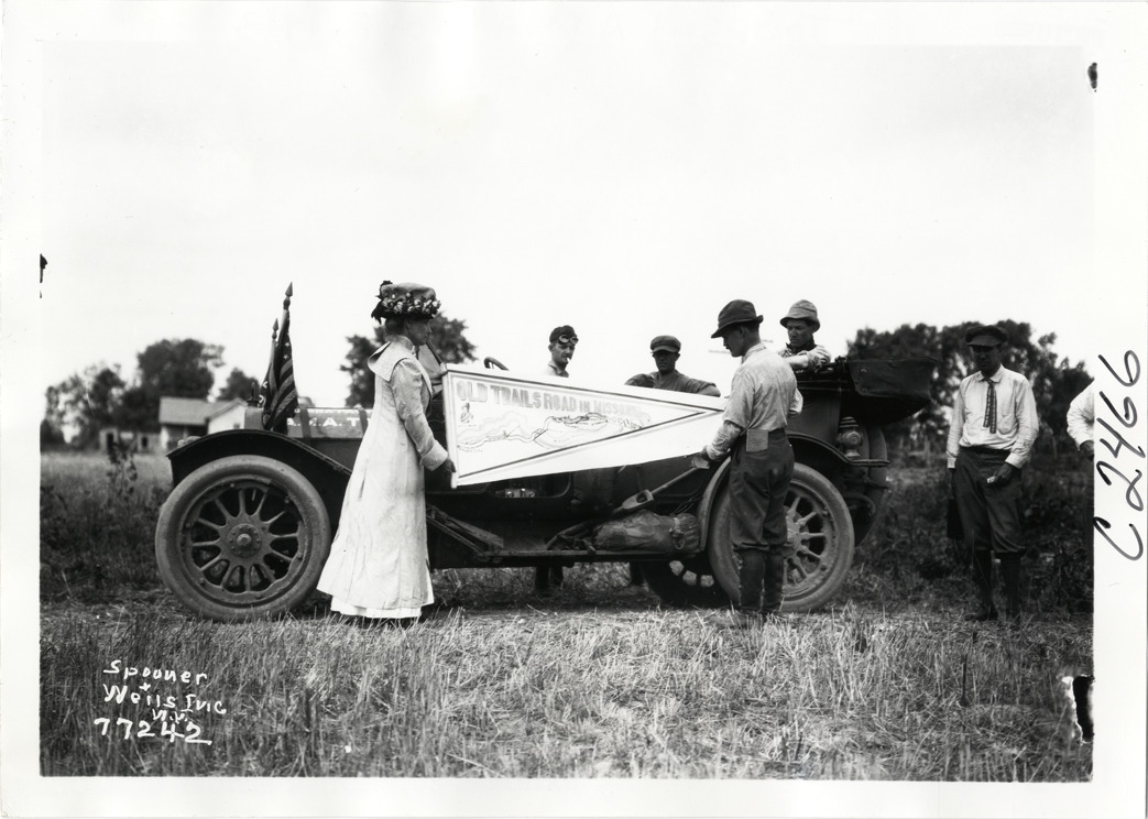 View of man and woman posing with "Old Trails Road in Missouri" flag or pennant during the 1913 transcontinental tour organized by Indiana Automobile Manufacturers' Association. Car and onlookers in background. Printed on front: "Spooner & Wells, Inc., N.Y." Handwritten on back: "Tours--I.A.M.A, 1913."