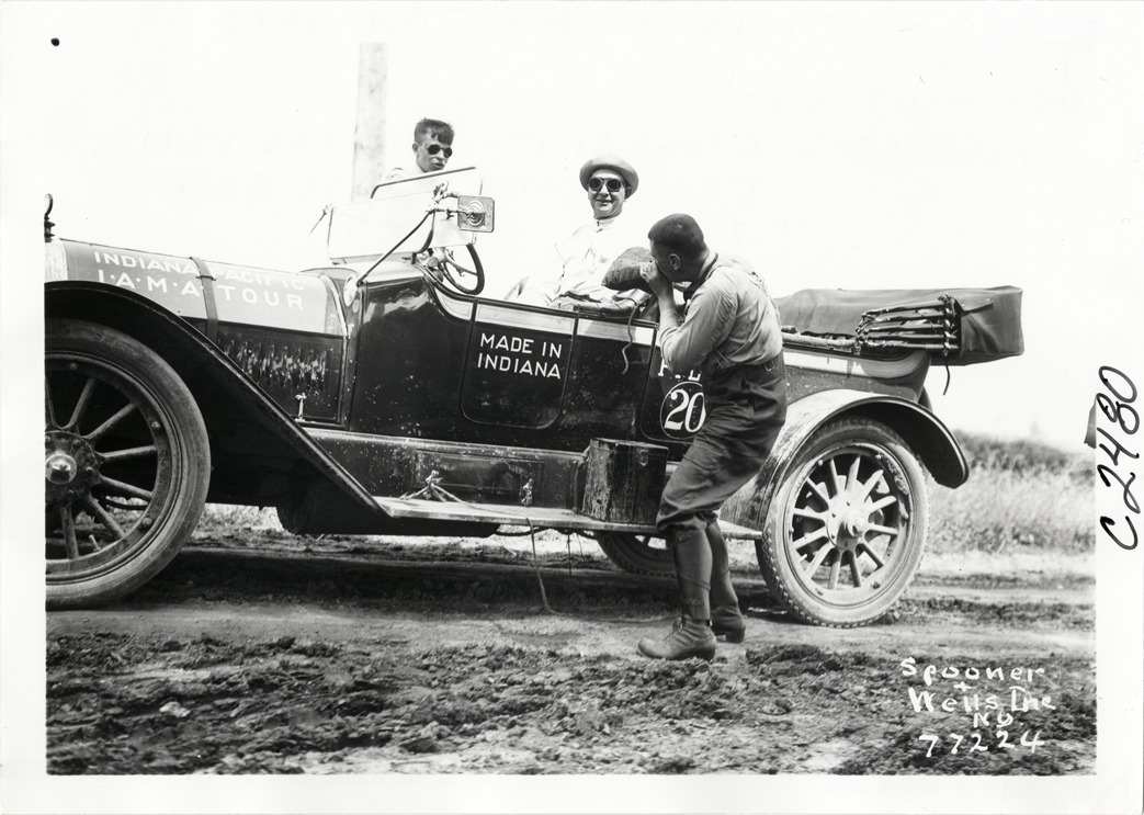 View of motorists with Pilot car no. 20 on rural dirt road during the 1913 transcontinental tour organized by Indiana Automobile Manufacturers' Association. Printed on front: "Spooner & Wells, Inc., N.Y." Handwritten on back: "#20 Pilot 'Sixty.' Passengers: G. Fred Smith, Charles Kent, F. Ed. Spooner, Russel Gaar. Tours--I.A.M.A, 1913."