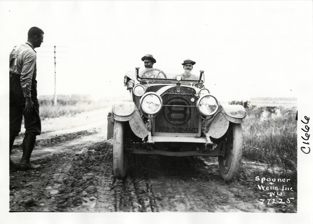 View of motorists in Marion car no. 8 on rural dirt road during the 1913 transcontinental tour organized by Indiana Automobile Manufacturers' Association. Printed on front: "Spooner & Wells, Inc., N.Y." Handwritten on back: "#8 Marion. Passengers: J.B. Dudley, E.G. Gager. Tours--I.A.M.A, 1913."