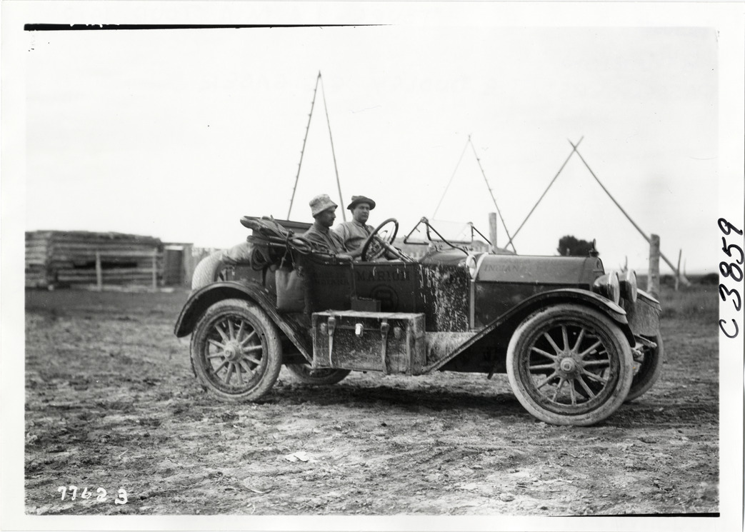 View of motorists with Marion car no. 8 on rural road during the 1913 transcontinental tour organized by Indiana Automobile Manufacturers' Association. Handwritten on back: "#8 Marion. Passengers: J.B. Dudley, E.G. Gager. Tours--I.A.M.A, 1913."