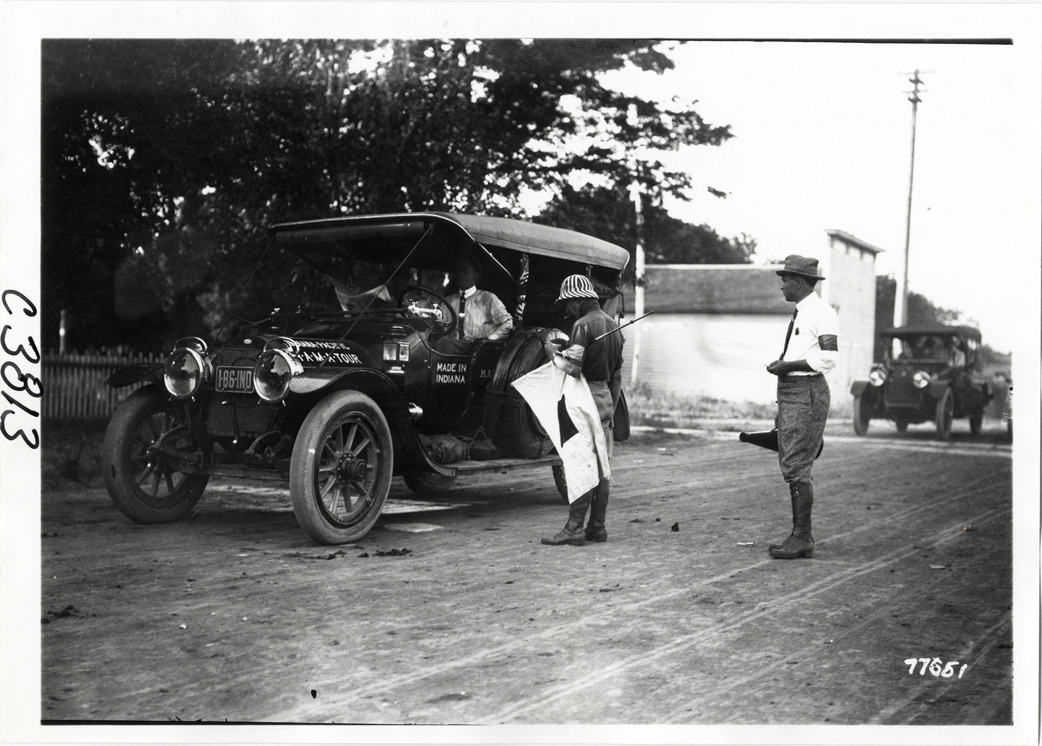 View of two officials, one holding a flag, standing next to Marmon car no. 22 during the 1913 transcontinental tour organized by Indiana Automobile Manufacturers' Association. Handwritten on back: "#22 Marmon. Passengers: "Carl G. Fisher, Charles A. Bookwalter, Robert Tyndall, Heine Schoeller. Tours--I.A.M.A, 1913."