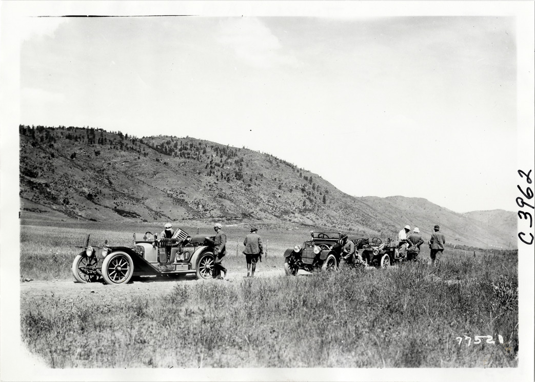 View of motorists with cars on rural road during the 1913 transcontinental tour organized by Indiana Automobile Manufacturers' Association. Handwritten on back: "Tours--I.A.M.A, 1913."