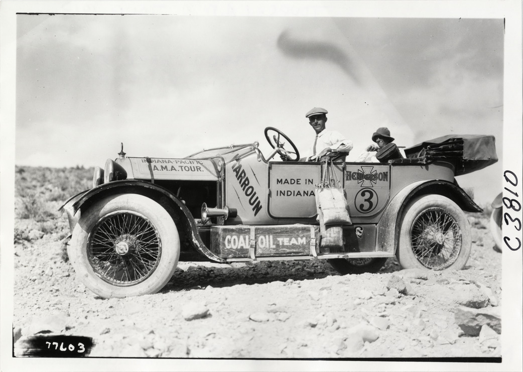 View of Ray Harroun posing in Henderson car no. 3 on dirt road during the 1913 transcontinental tour organized by Indiana Automobile Manufacturers' Association. Handwritten on back: "#3 Henderson. Passengers: D.M. Bell, Reed L. Parker, Allen C. Rankin, Ray Harroun. Tours--I.A.M.A, 1913."