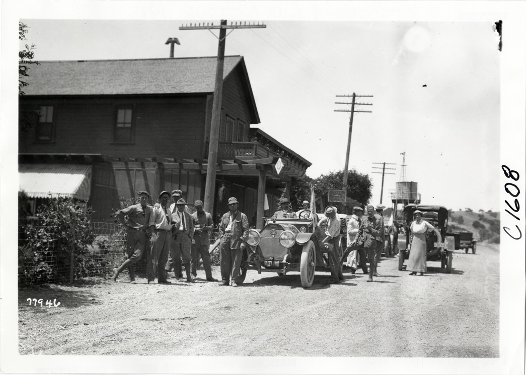 View of motorists with cars in front of unidentified building during the 1913 transcontinental tour organized by Indiana Automobile Manufacturers' Association. Water reservoir in background. Handwritten on back: "Tours--I.A.M.A, 1913."