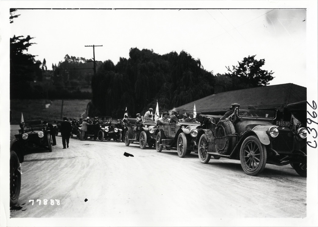 Automobiles lined up in road, 1913 Indiana Automobile Manufacturers' Association tour