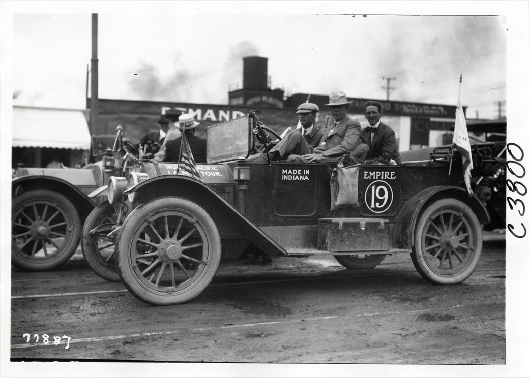 View of motorists posing in Empire car no. 19 during the 1913 transcontinental tour organized by Indiana Automobile Manufacturers' Association. Handwritten on back: "#19 Empire. Passengers: Cecil Gibson, Harlow Hyde, J.M. Cooley, Joe Moore. Tours--I.A.M.A, 1913."