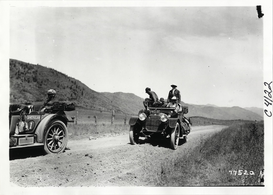 View of motorists with McFarlan car no. 16 and American car no. 1 on rural dirt road during the 1913 transcontinental tour organized by Indiana Automobile Manufacturers' Association. Handwritten on back: "#16 McFarlan. Passengers: A. Dixon, Guy C. Core, Christopher Cox, Bert Adams. Tours--I.A.M.A, 1913."
